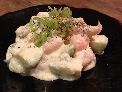 3.器に1のアボカド、2のえびとフライパンに残ったオイルソース、マヨネーズ加え混ぜる。
